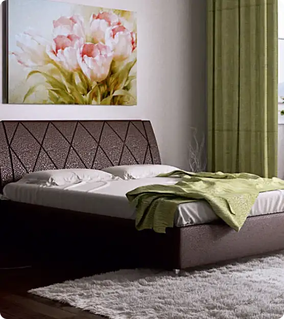 Особенности кровати ВеронаСпинка кровати изготовлена из ДСП толщиной 16 мм, брусков из массива древесины и фанеры толщиной 9 мм. Настил головной спинки выполнен из поролона толщиной 20 мм, обеспечивая необходимую мягкость и сохраняя изящные формы спинки. Для видимых швов используются шелковые нитки высокого качества. Спинка устанавливается на плоские пластиковые подпятники.